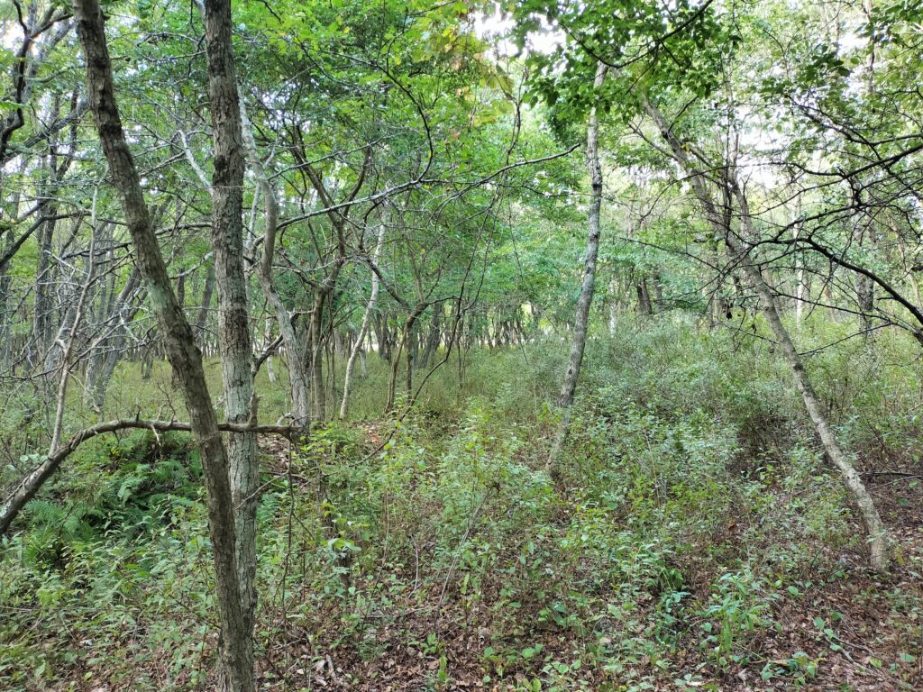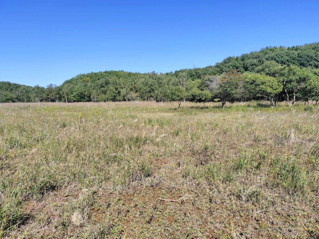 原図上では湿地だったのですが現地に行ってみると全然走れるラフオープンでした。ただしススキの高さはほぼ目線。ここを通せることがわかってようやくミドルのコースイメージが固まりました。渉外通してここを調査作図することにします。