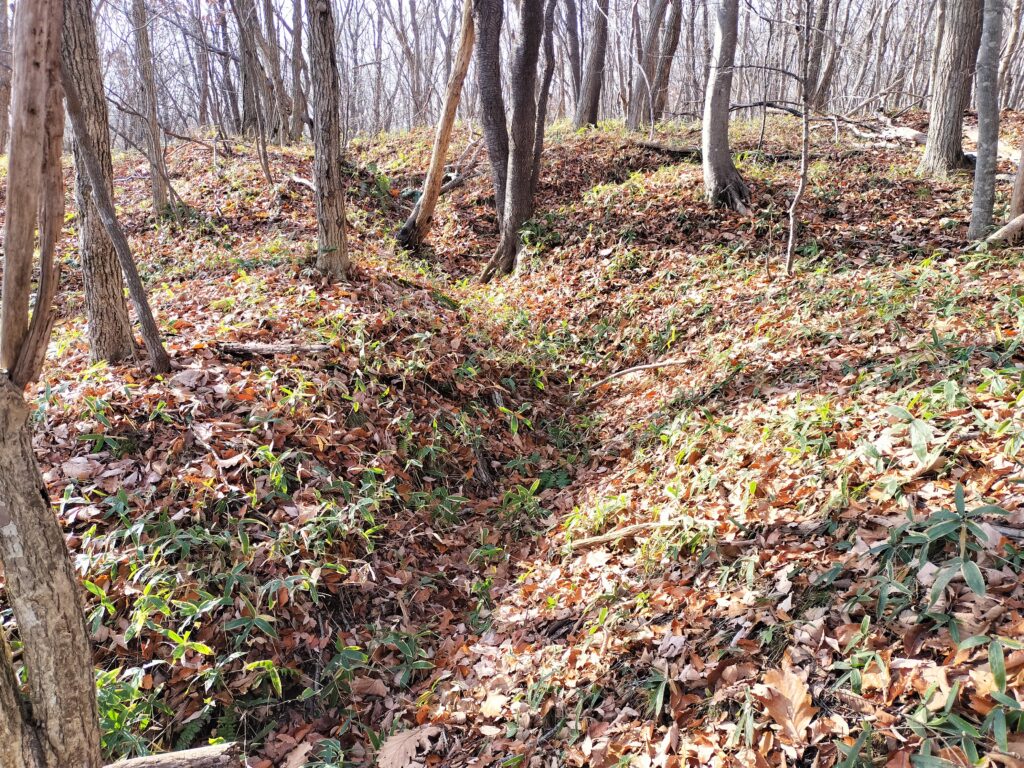 牧草地の端には離農した民家の土台があります。概して熊笹やヤブに覆われて走行度合いが悪いです。トラックの荷台部分が放置されていました。あとやたら割れた一升瓶が多いです。転んで割れたビンでケガしないように気を付けて下さいね。